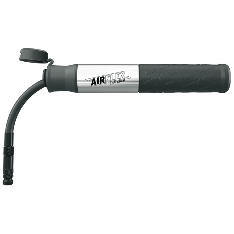 Mala pumpa s velikim učinkom: mini pumpa SKS AIRFLEX Explorer sada još lakše pumpa gume za brdske bicikle. Tajnu krije praktična kapica za prašinu. U cijevi pumpe nalazi se crijevo koje se može izvući i zavrnuti na glavu ventila za potpuno hermetički spoj Presta i Schrader ventila. Fleksibilno crijevo pruža mnogo prostora za pumpanje do tlaka od 5 bara. To ne samo da štiti ventil na biciklu, već ga čini i jednostavnim za korištenje. Mekana složena ručka i oblikovani rukohvat na prednjoj strani osiguravaju dobro držanje. Mješavina aluminijskih i plastično-ugljičnih komponenti s reljefom SKS čini lagane mini-pumpe obaveznim za bicikliste koji paze na dizajn.